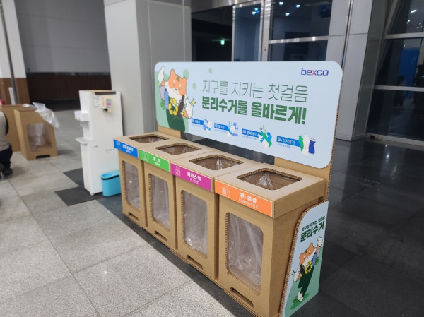 불필요한 플라스틱 사용을 줄이는 데 앞장서고 있다. 이 골판지 쓰레기통은 벡스코의 환경 캠페인과 ESG 실천의 일환으로,